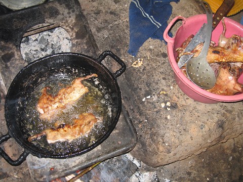 Step 6: Rotisserie Time.  Once the skin starts to brown, take the couy off the fire and rub oil all over it.  A little minced garlic isn’t a bad idea also!  Just think of those amazing rotisserie chickens that we buy in grocery stores in the States.  Is your mouth watering yet?