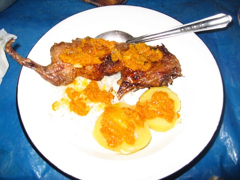 Step 9: Bon Appetit!  Here is an example of a halved couy.  Pick it up and tear into it.  Don’t be alarmed by the tough skin (kinda like leather).  I recommend the kidney.  Coey is usually served with rice, potatoes and a special sauce prepared from the couy fat, peppers, salt and garlic.