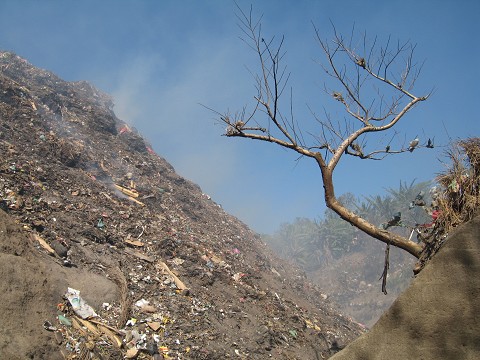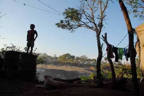 As we approach the stream of dirty, Diriumba water that lies at the bottom of the dump, our “escort service” eagerly scrambles to make a foot bridge out of the trash lying in the water – broken cement blocks, tires, boxes – so the ‘gringos’ can cross over without getting wet. Julio, one of the teenage boys, takes a standing leap and easily clears the water by a foot or two. He turns around, reaches his hand out for me to grab it and guides me across the makeshift bridge. Other than the toe of my tennis shoe dipping into the water, I make it free and clear. The rest of the kids skillfully skip on top of the trash and begin to head up the other side of the dump. This side is a bit more difficult because years of ash have piled up from burning the trash. The smoke burns my throat and lungs. The dust stings my eyes. My foot sinks into the ash. Once again, Karle grabs my hand and begins to lead me up amongst the burning piles of smoldering trash. We were warned to be careful of the unapparent “hot pockets” that lie hidden under a fine layer of ash. As Tim and I get near to the top of the trash pile, the kids gradually wave ‘Adios’ and retreat back to their house. We glance back to thier side and see a handful of individuals standing on the edge of thier property, frantically waving goodbye and yelling “Hasta luego”! I smile and wave back. It’s definitely not everyday that they see ‘gringos’ trampsing through the Diriumba Landfill.