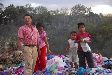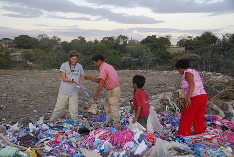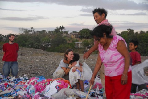I crawled up onto the pile of cloth and started to dig. I glanced over at the family. The little girl held their white sack open. The other three dug though the multicolored cloth heap searching for the ideal peices of fabric in order to create thier masterpiece. I picked up a long, skinny, peice of purple cloth. A perfect headband I thought. Just then it slipped through my fingers and the wind took it. It blew by the little boy, Jose, and gently landed next to his dad, who is also named Jose. Before the wind picked it up again, Jose (the dad) grabbed it and handed it back to me. He understood. Or maybe I was beginning to understand. This was not just trash. This random peice of cloth was my treasure. Not the other purple scraps in the pile, but this specific peice.