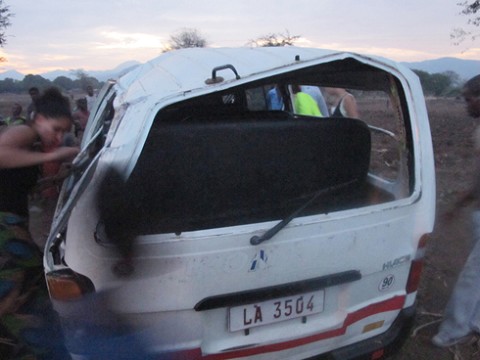 but God was protecting us BIG time. before it all happened I was listening to Mitch Hedberg on my ipod. My team always jokes with me because I’m deaf so I listen to my music really loud. well apparently everyone heard the tire pop, but me. I just remember seeing us loose control and then skidding to the side. I didn’t have time to think to brace myself or grab my head or anything- I had no idea what was happening. I remember rolling and being tossed around and thinking we were done rolling when we were not, but I don’t remember seeing anything- I had blacked out. before my eyes opened once we had landed, my shoulder and elbow hurt so bad I thought something had landed on it or we were on our side. but then when I did finally come to it and realized we were upright I immediately got up. I remember Caleb yelling to get out of the van, but I don’t remember how I got out. I just know Kimberly’s seat was on top on my leg and I was no longer in my seat but on the floor in between it and the side of the van. I looked over too and saw one of the Malawians- his head was gushing blood and he looked dead. My next memory is being on the outside of the right side or the car (the driver’s side here in Africa) with my earphones hanging out of one of my ears still. I was in shock so I just threw them on the ground. I had no idea where my shoes were. it wreaked of gasoline and there was glass everywhere. and I had no idea where any of my teammates were or if they were okay or not.