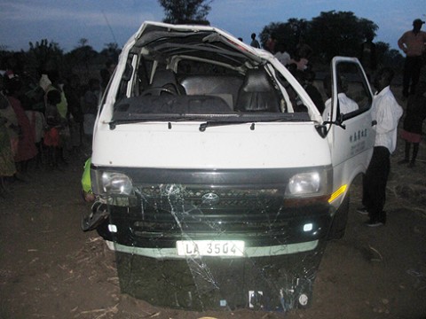 wellll so fast foreword about an hour and half into the drive, our driver had just tried to pick up a mom and her newborn baby, but we reminded him of the two passenger deal and so he drove on. Caleb had received a call from Josh our squad leader who was to be meeting us at the lake too. Caleb couldn’t hear so he shut the window next to Kimberly and I. No later than 10 minutes after Caleb had talked to Josh our van got a flat on the back right tire. in trying to correct for the bumpiness, the driver lost control of the van and we immediately turned 90 degrees and then we flipped 3 times into a ditch. Miraculously, we landed right side up. There are no seat belts or airbags well because T.I.A. and there is definitely no hospitals in the middle of the African bush.