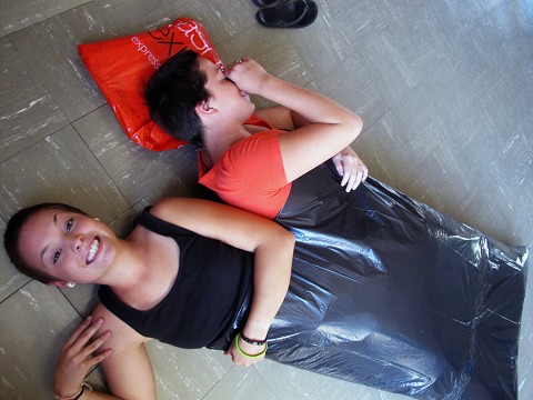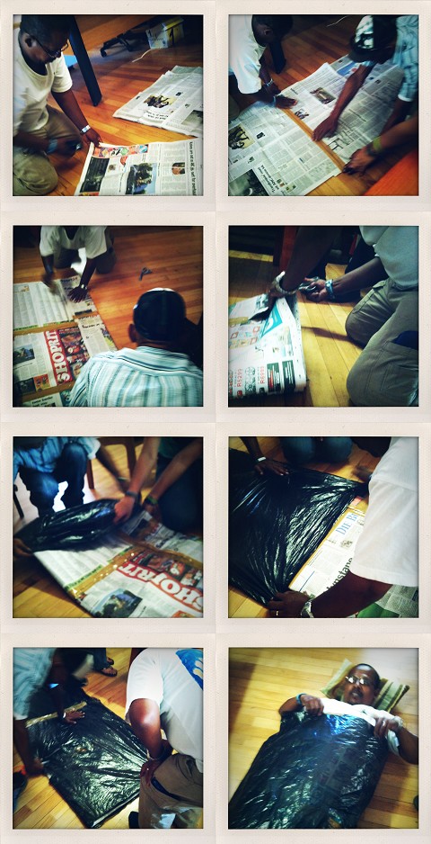 ^^Harold showing us how to make sleeping bags for the homeless out of newspapers and trash bags!
