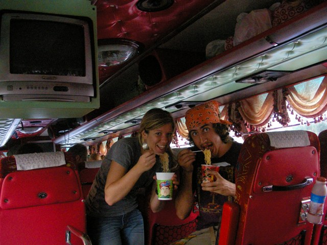 Zack & I eating noodles for breakfast on the bus ride to Cambodia!