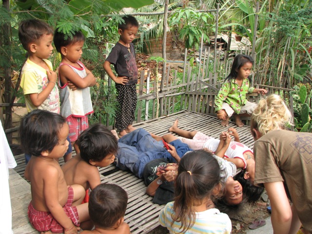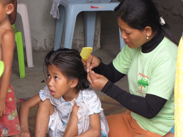 lining them up to shampoo their heads! picking lice out of the little girl’s hair
