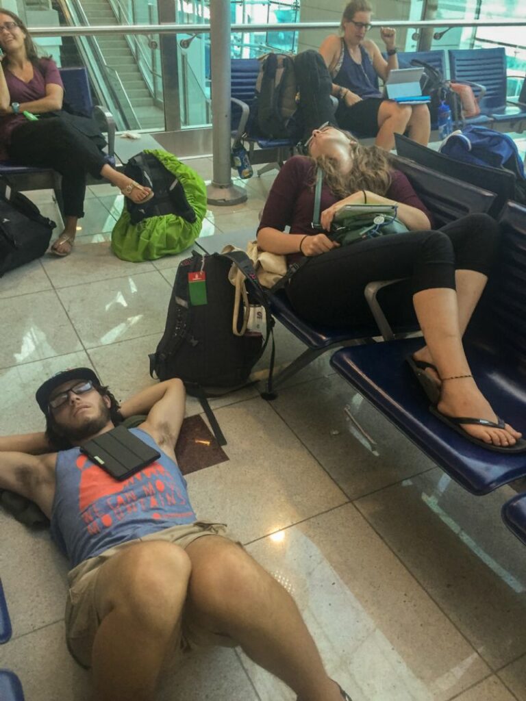 Dubai airport catching some sleep where we can.