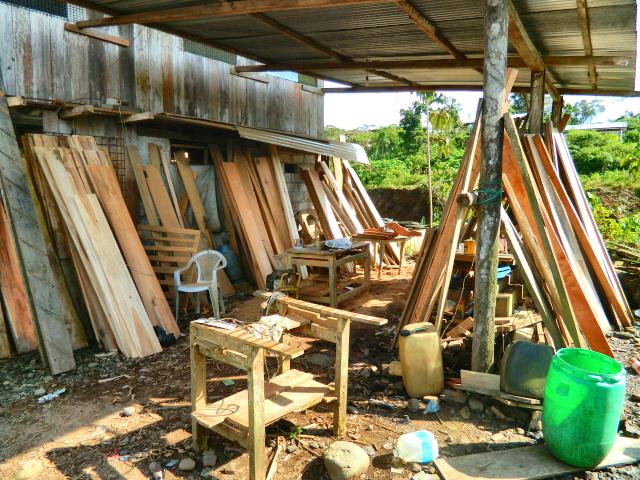 his carpentry area, shoveling out excess sawdust and throwing out rotting wood.