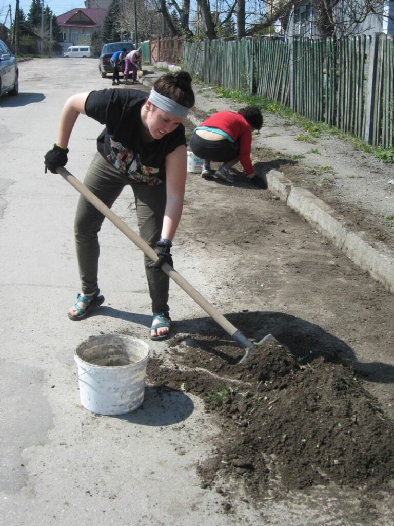 Here we are scraping mud off the street, bucketing it and carrying it to a soils pile so that it could be used for gardening later. We needed to clear it off the street so that we could paint the curbs.