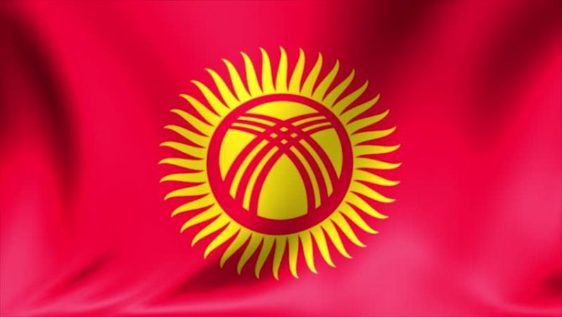 Features a sun with 40 rays, symbolizing the 40 original Kyrgyz clans. Inside of the sun is the crossbeams of the roof of the inside of a yurt—what one would see when waking up in a yurt.