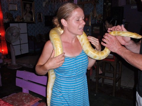 Holding the snake that "Mary" owned. This snake was in the bar everyday! And yes, it is as creepy as it looks!