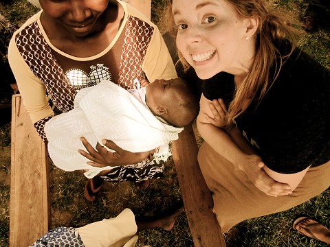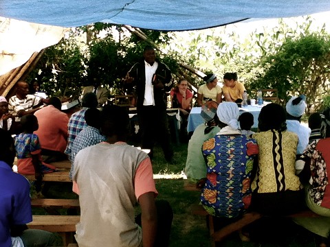 After the hour-long ride, we arrived and approached a house-church that met in a front yard, beneath palm trees, next to the chicken coop, behind the squatty potty, with smoke billowing from the fire that was boiling water for tea. They had set up a large, blue tarp overhead on sticks to create a make-shift awning to shield everyone from the sun’s intense rays, and thin, wooden benches served as their seats. There were probably 30 people, including many children and babies, turning their heads to watch us mosey in.