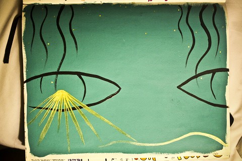 This is a painting that started out as nothing and became something. I first started up top with the strands. Then the dots of gold represent Jesus blood. From that I saw the face and painted the eyes. I saw a sun burst before but added it from the eye, representing that God is always watching. Then drew in the land. When I was finished I looked at it and was in shock, the gold I saw the stars in the sky, and the mountains, and land. Then the black was God, and he is big!