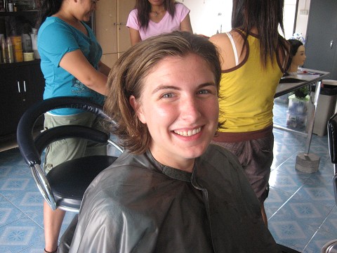 Now, those of you that know anything about coloring hair may be raising an eyebrow right about now. Yes? Well I had my suspicions, but was all for going with the show. They needed someone to learn on and this was my teams slow ministry day. Kristin arrived after Fon had completed two highlights and then reminded her that my dark hair would need to have peroxide first. So out went the two highlights and in went the peroxide!