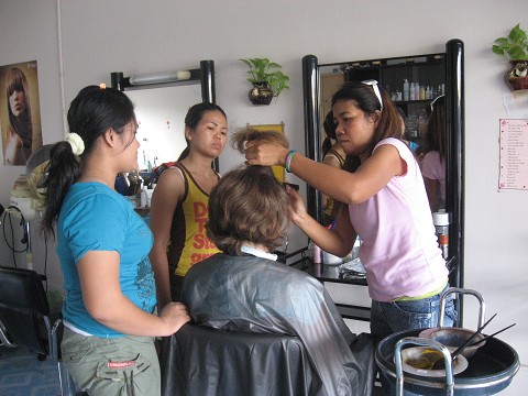 Kristin checked the peroxide and showed Fon how to accelerate the process by using a flat iron on the side that was foiled last. The foils were removed and I was sent to have my hair washed along with an amazing Thai head massage! Surprise, Surprise! I then was back to my seat as Fon picked through my hair grouping the strands together that had been treated with peroxide. Green/Blue/Green/Blue/Green…then wait. I’d get an occasional color check and then it was time to do a final wash or so we thought.