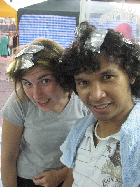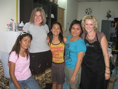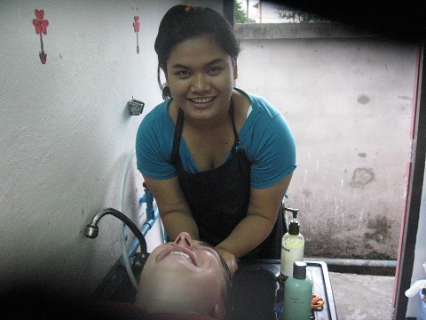 When we learned about Tamar Center we found out that they have a program for women committed to leaving the bars that provides classes to learn a skill. Right now there are four ladies who are participating in this 3 month program. They are provided with counseling, mentorship, and Bible classes (I believe 3 times a week) as well as choosing to learn either hair dressing or baking. Two of the ladies are learning in the hair salon from Fon. A hair stylist from California, Kristin, has come in as a missionary for about 4 months to teach these ladies the various tricks of the trade. I was more than willing to be a ginnea pig and jumped on the opportunity for highlights.