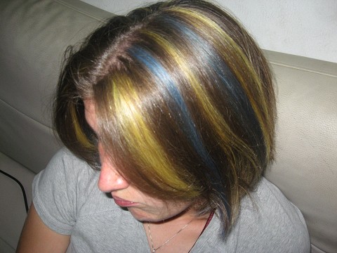I told the ladies that I wanted it to be fun and crazy, knowing that it’s permanent and could be fatal to my hair. To me it is worth them having fun while they learn. They then asked if I wanted more than one color, so I said sure! Whatever you like! They laughed at me, I’d say more with me, and chose green and blue. They then started tearing aluminum squares and prepping the color. Kristin hadn’t arrived yet, but had taught Fon highlighting the previous two days so she started separating my hair and applying color.