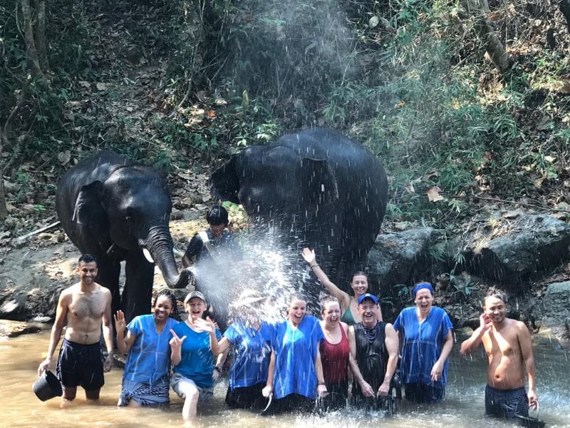 We spent our full off day with a couple of other families at an elephant sanctuary up in the mountains. We were able to feed them bananas and swim with them.