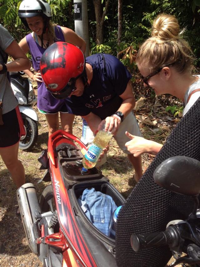 I looped back to find out what the problem was as I prayed that there hadn’t been an accident. About that time I see my teammate Jenni sitting on her scooter on the side of the road. I roll up beside her and she says, “I’m out of gas.” We brainstorm ideas and I decide I’m going to ride down the road and check out a couple of places to see if I can find any, but I was unsuccessful. I was told the closest gas station was about 20 minutes away. Another member of our scooter gang went to find a straw to use to try to siphon some gas into her mouth and spit it into the empty tank. That’s a true leader willing to sacrifice for the team, but it was a terrible idea and had she tried, we would have had bigger problems than an empty gas tank on our hands. Luckily one of our other scooter gang members was there and talked her out of it. I came back and found out that everyone had been unsuccessful in our quests for gas.