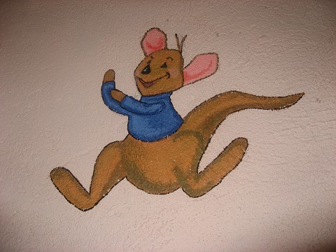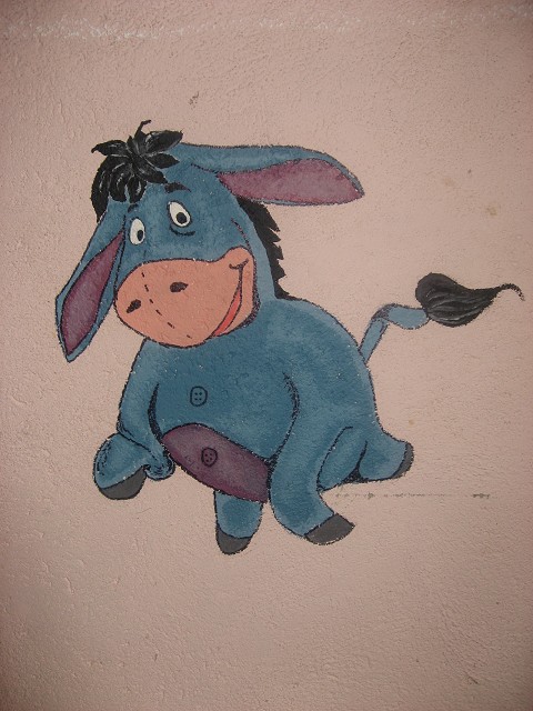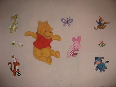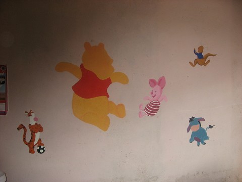 I’d been asked to do this mural several wks ago but thru missed communication and a back injury had not been able to do it until now. The AIM contact here in Nelspruit, Lynn arranged for me to go to Mrs Ella’s during school break and work on the wall for the baby’s room. She felt they (the babies) were not being stimulated and that this might do the trick. Many of you know how fond of cartoons I am (not very) but I did my best and used as many colors as possible. so take a look, let me know what you think. 🙂