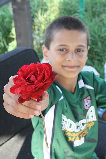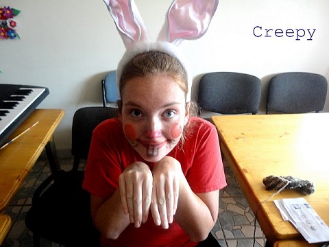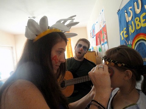 Young love. One of the 17 yr old boys was grounded one day and not allowed to leave the house or have visitors inside. We notice that he’s hanging out his bedroom window, talking to his girlfriend who is standing outside, and decided oh yes we totally have to go over and say hello. Did I mention it was costume day at the children’s home so we all have facepaint on?