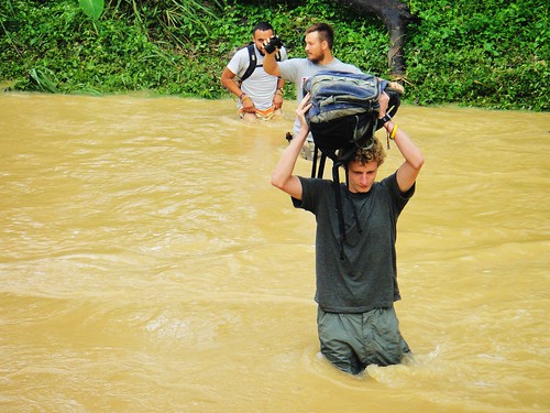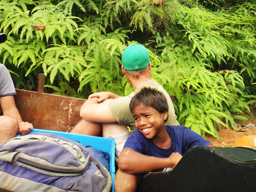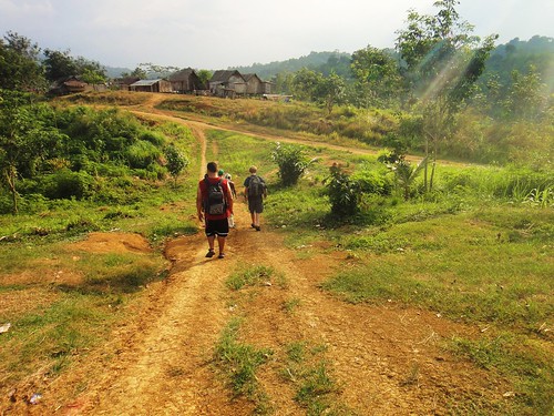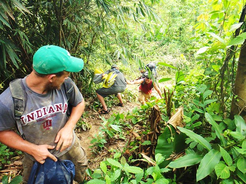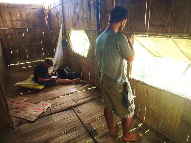 As noon rolls around, one of the village farmers exhausts his English vocabulary in beckoning us to head back up to the church for lunch, to which we eagerly oblige. We again unsuccessfully attempt to refrain from dwelling on the feasts that are characteristic of the day, but still manage to find nourishment and some enjoyment in our awaiting meal of rice with some unquestionable assortment of fish and greens. After breakfast Michael had discussed with our contact, the village pastor, the latest plans for the extent of our stay. Returning with the news of our pending departure the following day, we decided to spend our third and last night up in the church, abandoning the bamboo hut that has served us well the last couple days. Lunch is followed by a brief stint sprawled upon the church tiling before beginning the trek down to the hut to pack up our bags, praying that the river has lowered since our morning commute. It seemed wiser to retrieve our belongings now than after our afternoon shift, given the early sunset and fairly regular rainfall. The transition goes without significant complication, though the river crossing and hill climb require an additional dose of patience and humor after we have donned our packs for the return trip.