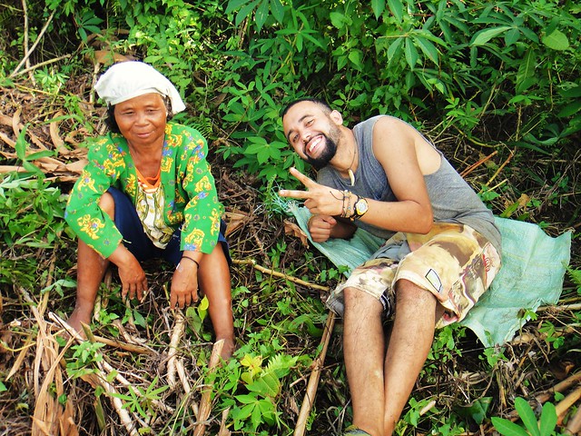 Upon the completion of our meal, Echo leads the way down to the main village and surrounding crops to begin the days work. Our ragtag parade marches on with Echo as our inverse pied-piper, enthralled by the attention of the strange Americans following him close behind, oversized water bottles in hand. We continue down the path, passing the field of the previous day’s work, curious what will be bringing the sweat to our brow today. We bear right off the path, stepping down the aisles off crops and hopping creeks that run along the field’s border. Cresting a hill, we find ourselves gazing upon an assortment of older village women speckling the hillside, grabbing aggressively at an assortment of branches and brush littering the ground. By this point we know not to assume the luxury of formal instruction, so we drop our water bottles and come alongside the work being done.