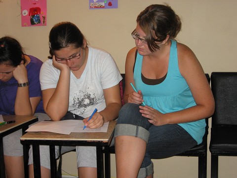 Summer and Aaron help campers proofread their papers. Me and Meri.