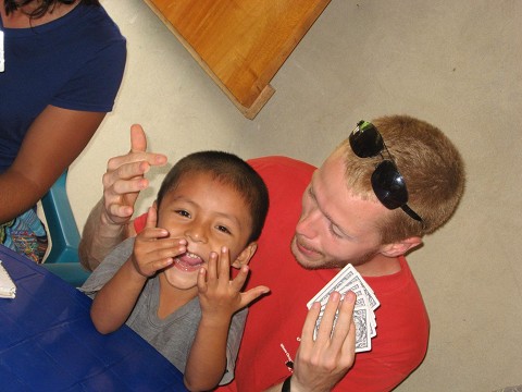 Playing tag in th field with the kids was fun.                                          The kids loved helping us play cards.  Mark and Sablo.