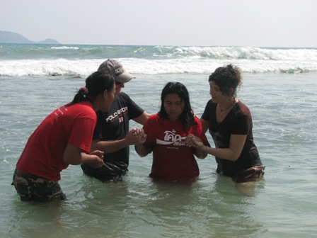 But, praise God, I also had the opportunity to water the seeds of another. The second woman who captured my heart was named Ice, or Ae, as we came to know her. The World Race team who worked at SHE last month met her in the bars and introduced her to SHE, and she moved in early on in their month of ministry. Ae getting baptizedHolli Lewis’ blog recounting her story is a fantastic preface to the story I will now share. One of the things our team shared with us before we went to SHE was that Ice was so close to coming to know Jesus, and that we needed to call them IMMEDIATELY when she became a Christian. Our team immediately fell in love with this woman when we arrived at the SHE house. Her sweet spirit and gentleness made it so hard for us to believe that only a month before she was working in the bars and selling her body for a living. We celebrated a birthday with her – in true American fashion…with burgers and chocolate cake! Our team spent afternoons laughing and talking with her – sharing about our faith, and each night she would watch our team go out to visit the streets she used to work on. Her curiosity about Jesus was so evident as she would ask questions in broken English, and every night we’d see her reading her Bible. The other team was right, she was so close. Then one evening, Ae and two other Christian Thai girls and Jenni sat down and began praying together and studying the Bible together. As I observed the meeting they were having, it was clear that God was definitely moving in an incredible way. That night, 4 of us were supposed to go out to ministry– but of those 4, one had a migraine, one had a hurt foot, and another was not feeling well. So for the first time, we decided to not send out a team to Patong. Instead we decided to get together as a team and pray for the conversation that Jenni was having with Ae in the next room. An hour later, Jenni came bounding into the room announcing that Ae had just accepted Christ! Praise God. We all went in and gave hugs and sat and talked with her – it was amazing! Three days later, she was baptized in the ocean…at Patong Beach. The place that tainted her soul was the place God used to show the worOur team praying over Ae after she was baptizedld that she has now been washed clean, white as snow. It was so beautiful. As we drove away on our last day, I held her hand as she walked behind the truck we were riding in until she had to let go. My heart was so sad to leave her – such a new Believer that needs great encouragement and protection as she learns how to have a strong relationship with God in a culture that is far from God. But we did our part…we watered the seed that the last team had planted. We saw the amazing fruit of the labor of those who came before us…and someone else will come behind us and water this young Believer so that she grows strong and close to the Lord.