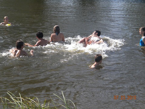 There is a pond that the children and camp counselors go to in the afternoon during free time. At the lake we had a lot of splash fights, chicken fights, volleyball etc. This is also the pond that the cows come through and bathe in. So we have to get out of the pond and wait for the cows to swim through and then the kids get back in. Aly was convinced that she was stepping on cow ¡¥patties.¡¦ And yes we all swam in this water. Brittany even had a little surprise of something sucking on her leg. Yum.
