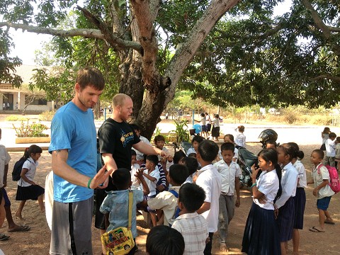 After a nice breakfast we go to the school right down the street and play with kids before they go to class. They normally just poke and hang all over us.