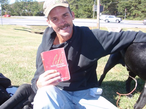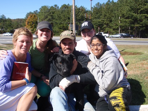 Tabby, Liz, Sammie Jo, Katie, and I stopped at a gas station on the way out of Georgia. One of the girls saw a man sitting on the curb with his dog. She said we should all go talk to him. I thought to myself, "We really should go talk to this man, but we have like a 9 hour drive home, i am tired, i need a shower, and i don't really feel like ministering to this man." Selfish I know, but I am being honest! One of us even mentioned, "I cannot even look at him, because if I look then I will have to talk to him."