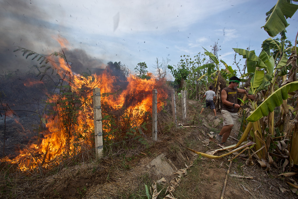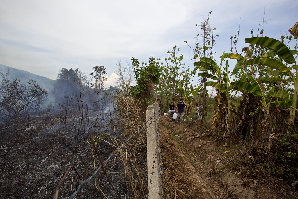 It just a normal day off and we had just gotten back from church service at the property. We were all kind of doing our own thing, playing cards, watching movies, surfing the internet. Typical day off stuff. All of a sudden our neighbor, who works fo Remember Nhu, came running in saying the property was on fire! We all kind of froze not quite understanding what she really meant, but then she said to get ready to be picked up and go put it out! Instantly we all ran to change into work clothes and went outside to wait for the truck to arrive. We somehow managed to cram 20 people in 1 pickup truck and drove strait to the property, and when we arrived we were instantly blown away by the size of the fire! We were also very scared for the girls safety. The flames were huge and it had already consumed about 3 acres of the neighbors land and quickly heading toward the girls land. We did our best to run hoses, grab buckets and fill them with water, anything that we could, but the flames were not going to be tamed by our little buckets and garden hoses. At least, that's what we thought going into this.