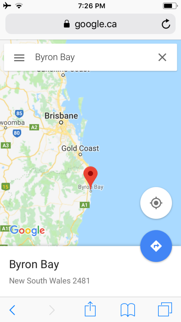 I’m pleased to inform you that I’ve safely arrived in Australia. I’m currently sitting on a couch at East Gate Church which is located just outside of Byron Bay (see map below).