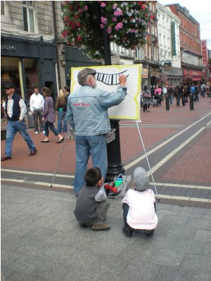One of the contacts, Mickey, that we did street evangelism with in Dublin. He would use these pictures to attract and audience, and he would share the gospel with them. After he was done we would start conversations with the onlookers.