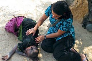 He was curled up on the concrete ground next to the dumpster when Raja found him. His clothes were ragged, and he wore no shoes. Flies clustered around an open sore on his knee. He was rambling to himself incoherently with his eyes closed.