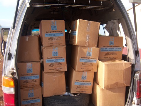 Here are the boxes of food that we helped to deliver to some of the care points.  In each box there are 36 packages of rice/soy mix for the children to eat.  Each meal costs 3 cents because the Feed My Starving Childrenorganization donates the food, and then people only need to pay for shipping – working out to 3 cents/meal.