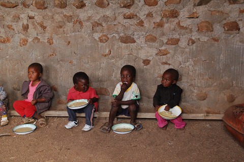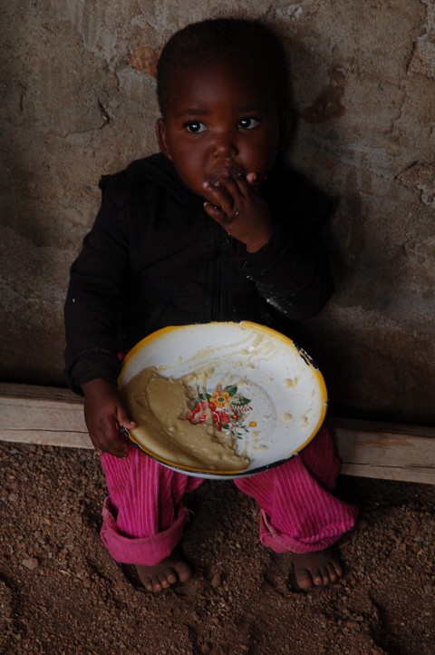 These are some of the kids from the above care point (the one with the stick building).  In their plates is the food they are fed for breakfast every day.  At some care points the kids get breakfast and lunch, some they only get lunch, and sometimes the care points run out of food and can’t give them any.