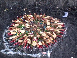 sugar, eggs, soda, beer, and canned food placed in a circle and lit on fire. (They would toss the canned food in the fire