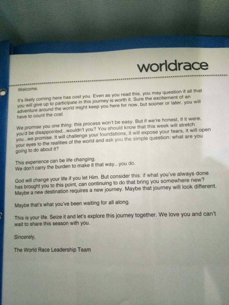 Yes, it was somehow all of that and much, much more! I wish I could share everything that I experienced but I would turn this post into a novel, and neither of us want that! So I will try, at the best of my ability, to make this as short and sweet as possible! But remember, I am still me. The long winded, Southern girl once named “Mouth of the South” by her grandfather… So don’t hold your breath, but instead sit back, relax, and cozy up with “Whitney’s Adventures At World Race Training Camp.” I hope you enjoy! And I promise I am actually working on the long-windedness. So, let’s begin. ๐
