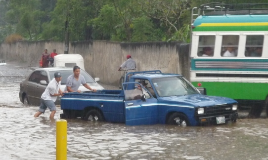 and a black man push a Guatemalan truck out of flood water all applauded and