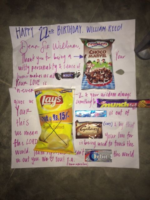 – a giant poster full of chocolate and snacks with paragraphs written on the poster using the wording from the wrappers