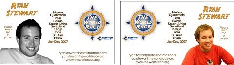 I just wanted to show you guys the prayer card thing I made. They are business card size, and I have printed some out as magnets too. I have business cards for myself for photography/graphic design that I give to people, and I’ve been telling a lot of people about the race and what i was doing before was just writing the wr site and my blog site on the back of that card, so i decided i really needed to make a card specifically for this trip.